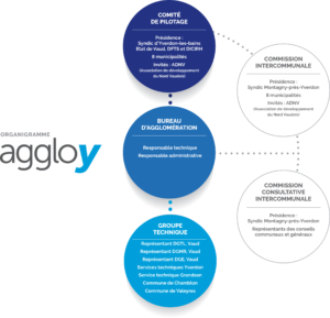 AggloY est une structure intercommunale composée de huit communes, d’acteurs politiques et techniques et de représentants du Canton de Vaud qui élaborent la planification globale et accompagne la mise en œuvre des projets de mobilité et d’urbanisation du projet d’agglomération. AggloY est composé d’un Comité de pilotage formé de représentants politiques, d’un groupe technique et d’un bureau technique.